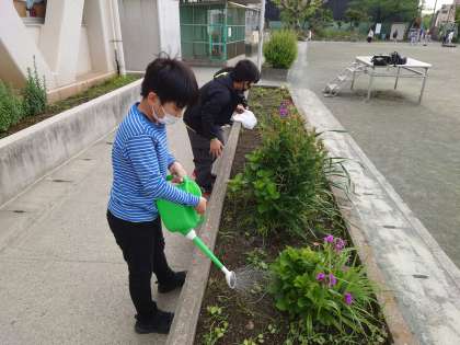 今朝は、体育委員が校庭整備を、環境整備委員が植物の世話をしていました。(4月18日)