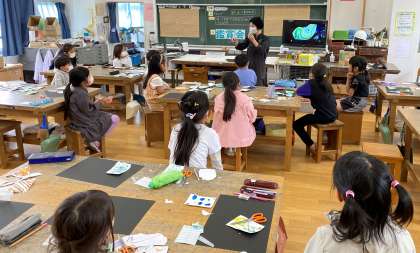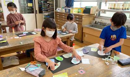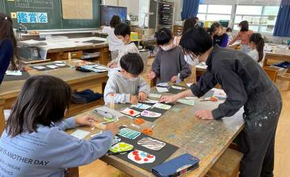 『えのぐ LABO』の学習では、絵の具でできることをたくさん見つけました。色や筆づかい、水の量を変えて模様をつくりました。今日は、作品にタイトルをつけたり、台紙に貼ったりして仕上げをしました。子どもたちは夢中になって取り組んでいました。