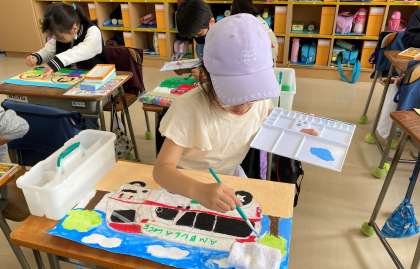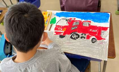 教室で消防写生会の仕上げをしました。2年生は、絵の具を使用して背景を塗りました。
