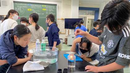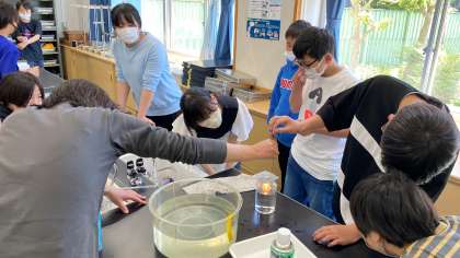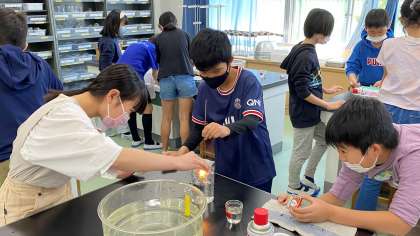 実験方法を考え、実験をして確かめました。子どもたちは、マッチを擦る経験が少なく、緊張していました。担任と理科支援員が見守る中、協力して実験に取り組んでいました。