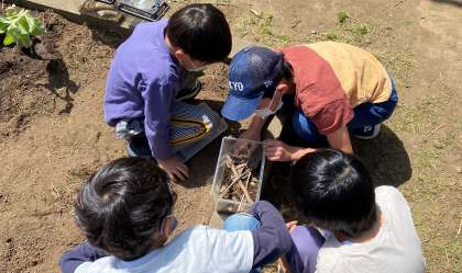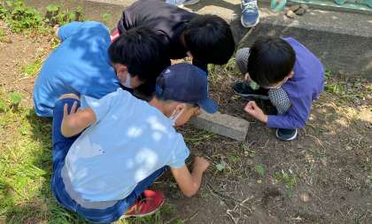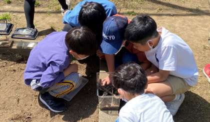 3年生の子どもたちは、教室で飼育しているカナヘビの餌を捕まえようと一生懸命です。捕まえた餌を水槽に入れ、注意深く観察していました。