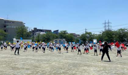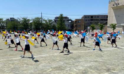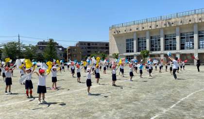 運動会に向けて、学年練習が始まりました。2本の小旗を持ち、曲のリズムに合わせて操作します。短時間で動きを覚えることができました。