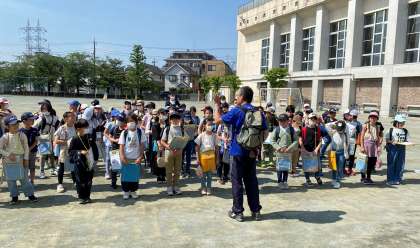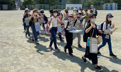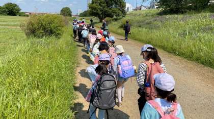 11日(木)の朝は、雲一つない青空。天候に恵まれ、遠足日和でした。子どもたちは笑顔で出発し、二子玉川公園まで、河川敷を歩いて行きました。
