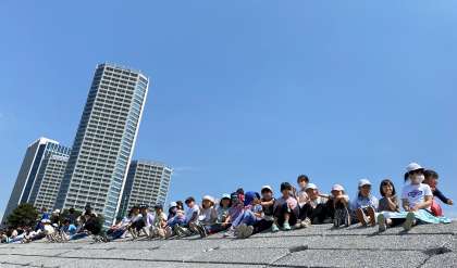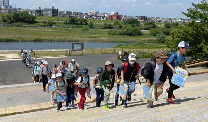 河川敷では、子どもたちの笑顔があふれていました。二子玉川公園、エントランス広場へ向かいました。