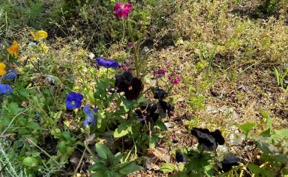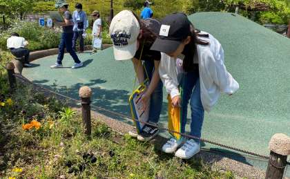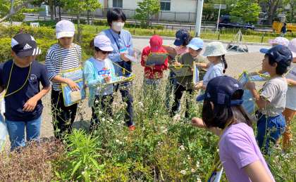 植物や昆虫を観察して、カードに記録していきました。子どもたちは、黒く見える花を見付けて、驚いていました。