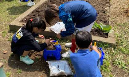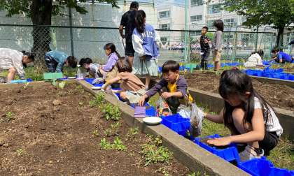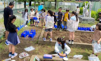 「植物を育てよう」の学習を進めています。鉢に土を入れて、ホウセンカの種を植えました。班の友達と協力して作業を進めていました。