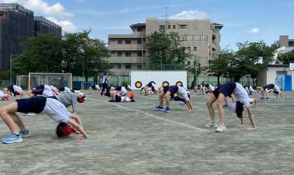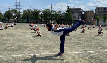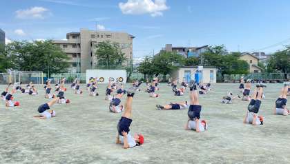 組体操の一人演技に挑戦しています。担任の手本の演技に子どもたちは拍手をしていました。美しい演技を目指して練習していきます。
