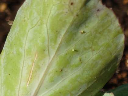 教材園のキャベツにモンシロチョウのたまごがついています。(5月16日)