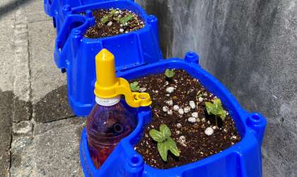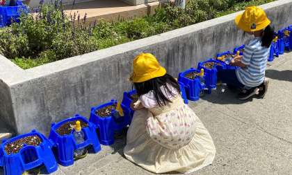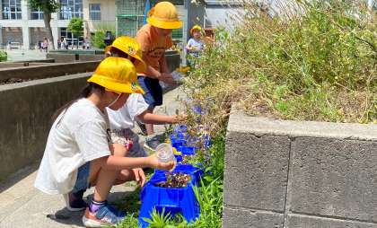 鉢に植えたアサガオの種は芽を出し、双葉に育ちました。子どもたちは水やりに一生懸命です。
