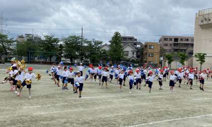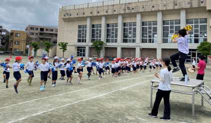 クラスカラーのポンポンをもって踊りました。1組が赤色、2組が青色、3組が黄色です。本番では、バンダナも身につけます。