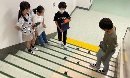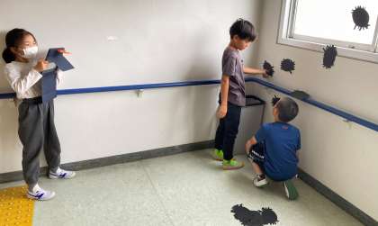 「すがたは見えないけれど」 『謎の生物』についてイメージを広げ、グループで相談して、足跡の形を決めました。黒い紙で足跡をたくさんつくりました。