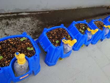 あいにくの雨となってしまいましたが、植物には恵みの雨です。子ども達のホウセンカも子葉が出てきています。(5月23日)