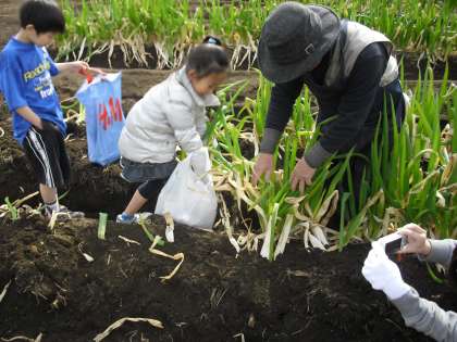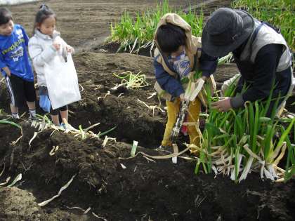近隣で、野菜を作られている方の畑で、「ねぎ堀り体験」をしました。