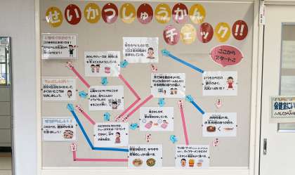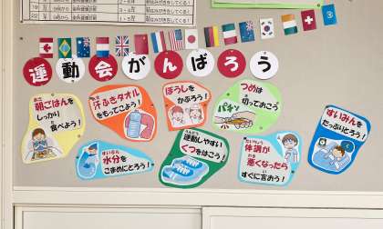 運動発表会に向けて、朝ごはん、睡眠、水分、汗拭きタオル等、子どもたちへのメッセージです。『生活習慣チェック』は、子どもたちが立ち止まって自らチェックしています。