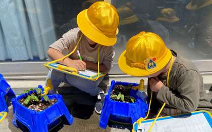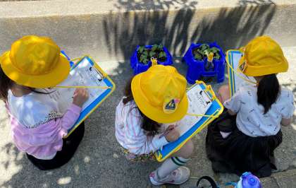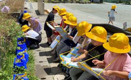 自分で植えたアサガオの観察をしています。観察カードに絵と文で表現しました。