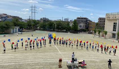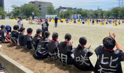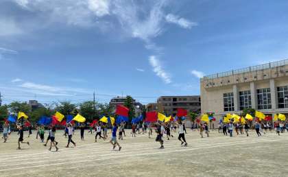 表現運動『一歩踏み出せば 〜玉堤 個性の旗〜』動きがそろいました。6年生の応援の拍手が嬉しいです。