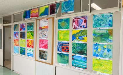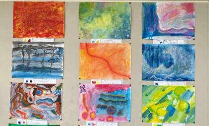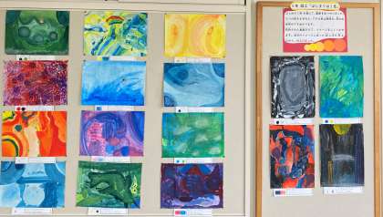 「はじまりは2色」の作品が完成しました。はじめの2色を選んで、画面を塗り分けました。2つの色を混ぜると、できる色は無限大。思わぬ世界ができあがります。彩色された画面をみて、イメージをふくらませます。自分のイメージに合った表し方を考えながら、仕上げました。