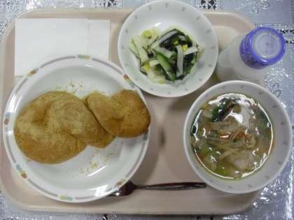 今日のメニューは、6年生のリクエスト給食の第2位です。きなこ揚げパン、ワンタンスープ、大根海藻サラダ、牛乳でした。揚げパンの人気は、今も昔も変わりません。