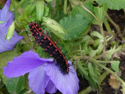 校庭にツマグロヒョウモンの幼虫がいました。みんな、珍しい色に興味をもって眺めています。(6月14日)