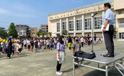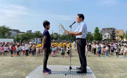 校長は、5年生が総合的な学習の時間に学習している「サステナブル」についてお話しました。次に全国剣道大会で活躍した児童の表彰を行いました。図書委員の児童は、今週実施する読書週間についてお知らせをしました。
