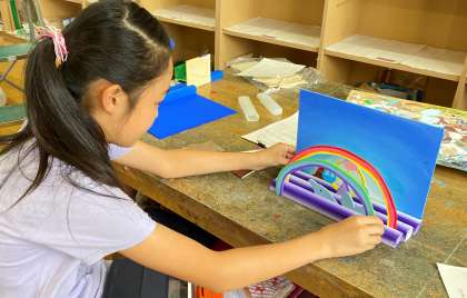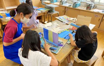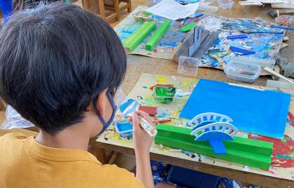 「エンキンワールド」の学習をしています。遠近を考えて仕上げをしました。金槌の使い方や塗り方の技能も大きく向上しました。
