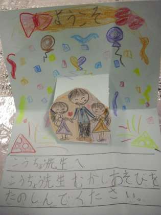 インフルエンザの関係で、幼稚園との交流が中止となり、準備をしていた1年生が、学年で、「昔遊び大会」を行いました。私に招待状を作成して、届けてくれました。最後に楽しい時間となっていました。