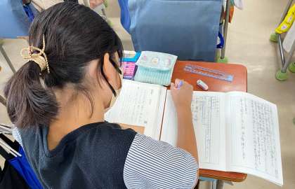 「古典の世界」について学習しています。『徒然草』『奥の細道』を音読して、現代語訳で内容を確認し、作品を読んで感じたことをノートに書きました。昔の人のものの見方や感じ方について考えることができました。