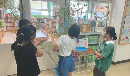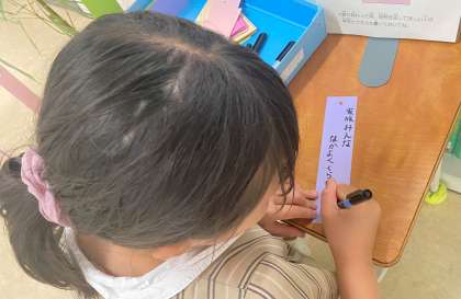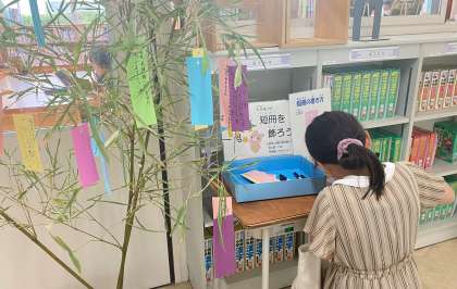 子どもたちが短冊に願いごとを書いています。心温まる願いごとがいっぱい!図書室前に飾っています。