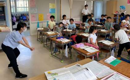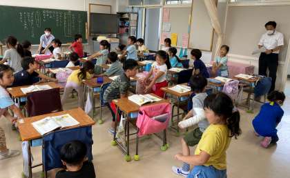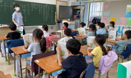 物語「おおきなかぶ」の学習をしています。まず、登場人物のおじいさんの気持ちを考えました。種をまいた時の場面では、自分たちが朝顔の種を植えたときの経験から考えました。動作化をして、イメージを膨らませて工夫して音読できました。
