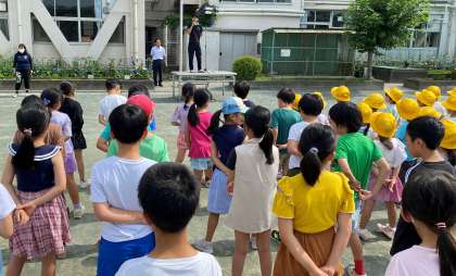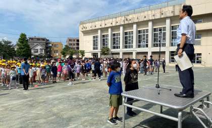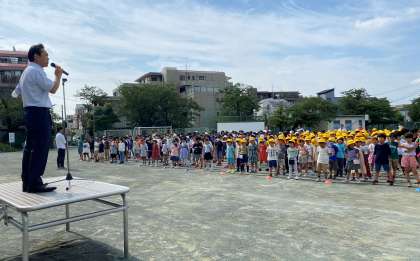 あいさつをリードするのは、6年生の代表児童です。毎週順番に役割を果たしています。校長講話は「七夕の由来」についてです。子どもたちは、興味をもって聞いていました。看護当番の教員は、今週の目標「暑さに気を付けて生活しよう」について、目標を達成するために、帽子をかぶること、水分を補給すること、元気に遊んで汗をかくことについて伝えました。
