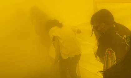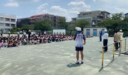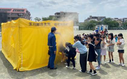 今日の避難訓練の想定は『職員室より出火』です。玉川地域振興課の方から火災の時の避難の仕方について教わりました。5年生は、煙中体験も実施しました。低い姿勢で壁伝いで出口にたどり着く方法を体験的に学びました。