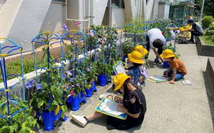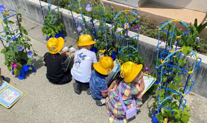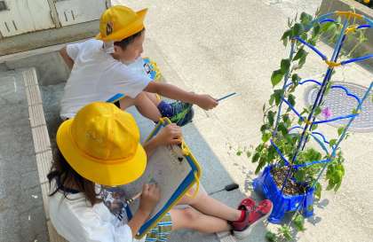 種から育てているアサガオの観察をしました。気が付いたことを絵と文章で表現しました。暑いので、色つけは教室で行いました。