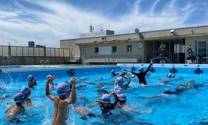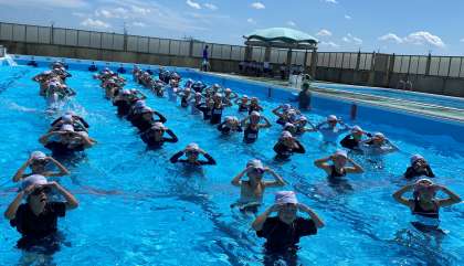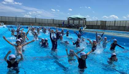 水遊びを思い切り楽しみ、検定にも挑戦しました。音楽のリズムに乗ったダンスの動きも慣れてきました。子どもたちの笑顔が印象的でした。