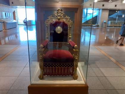 久しぶりの国会見学です。これから国会の中を見せてもらいます。天皇陛下が座られた椅子が展示してありました。