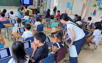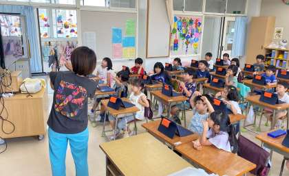 iPadを使ってロイロノートの使い方の学習をしました。写真を撮り、ファイルに保存して先生に提出する方法を実際にやってみました。子どもたちは自分の操作で写真を送ることができると、手を叩いて喜んでいました。ICT支援員の方にもお手伝いいただきました。