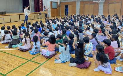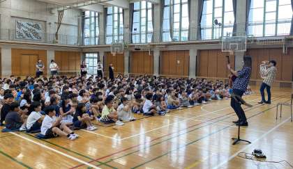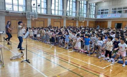 エバリーの演奏家をお招きし、1年生、2年生、3年生を対象にコンサートを開催しました。演奏楽器はギターとユーホニアムです。ルパン三世のテーマやディズニーメドレーを演奏していただき、子どもたちはノリノリでした。アンコールでは校歌を演奏していただき、子どもたちは美しい声で歌っていました。