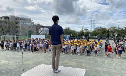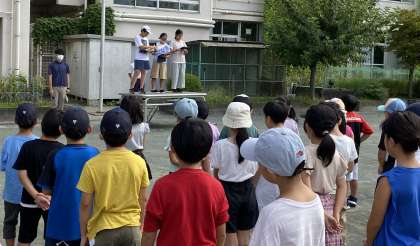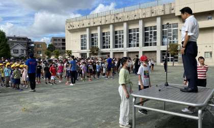 2学期はじめて、校庭で全校朝会を実施しました。校長からは、「スポーツと学習」についてお話がありました。運動委員は、ボールの空気入れの活動について連絡しました。看護当番の教員は、今週の目標「すすんで友達とかかわろう」についてお話しました。