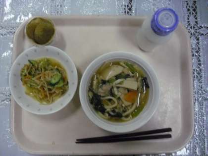今日のメニューは、煮込みうどん、ごま酢あえ、よもぎ団子、牛乳でした。