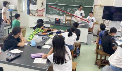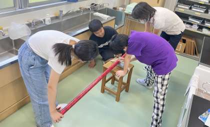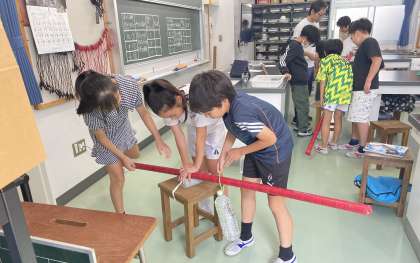 「てこのしくみとはたらき」について学習しています。課題は『てこを使ってものを持ち上げるとき、小さな力で持ち上げるには、どうすればよいのだろうか』です。日常の経験から予想を立て、実験方法を考えてグループごとに実験をして確かめました。