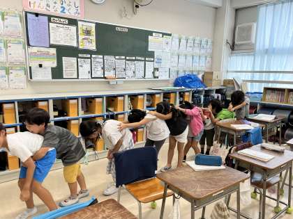 登場人物を演じてみようという単元で、「いっぽんみちをあるいていたら」という物語の学習をしました。場面ごとに分かれて、各グループで役割を決め、劇をしました。大きなおばあさんや長い猫、10人兄弟のおじいさんなどを体を使って工夫して表現しました。