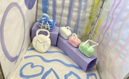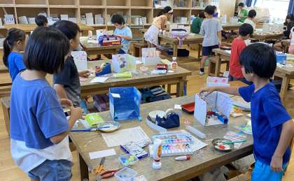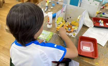 「本日開店!」の学習を進めています。今日は、お店全体を考えて、商品やたなを作りました。授業の終わりのチャイムが鳴った時、「もっとやりたい!」と子どもたちは叫んでいました。