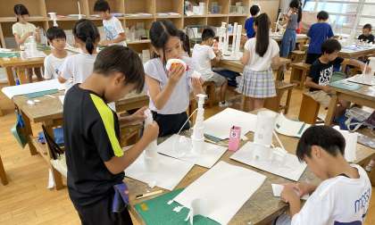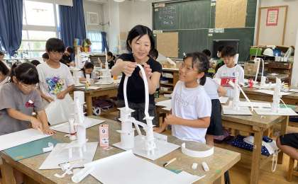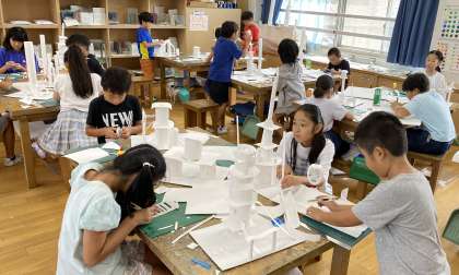 「クルクルタワー」の作品作りをしています。今日のめあては、『タワーにやってきた人の気分になって仕上げよう!』です。子どもたちは展望台をつけたり、ゲートをつくったりして夢中になって取り組んでいました。