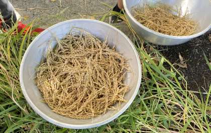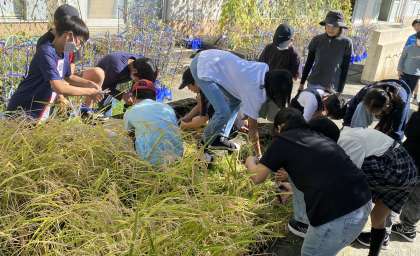 4月から育ててきた稲が豊かに実りました。稲や穂の触り心地を確かめながら楽しそうに稲刈りをすることができました。おやじの会の皆様、理科支援員の方には、育苗のセッティングやネット張りなどでご支援をいただき、ありがとうございました。子どもたちにとって、貴重な体験活動ができました。