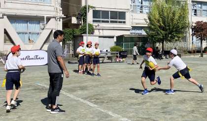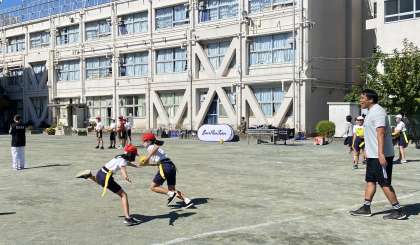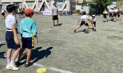 2人組でキャッチボールをして、ボールを回転させないで、パスをする技能を身に付けました。最後に1対1でトライゲームをしました。子どもたちは、夢中になって取り組んでいました。