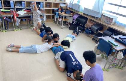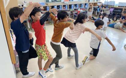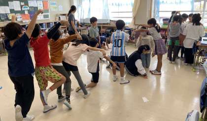 先日の学級会で話し合って決めた活動『一つのものを作るゲーム』を実施しています。クラスの課題を解決するための活動です。声を掛け合い、協力して取り組んでいました。
