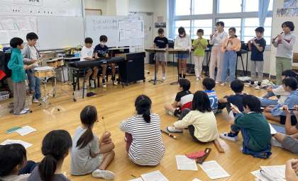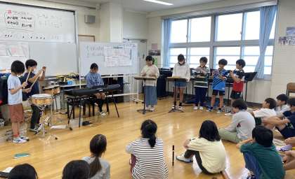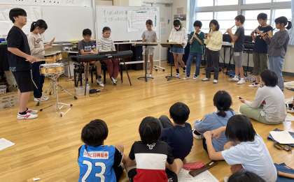 グループごとに「リボンのおどり」の曲を演奏の仕方を考えて練習してきました。今日はその発表会です。分担した楽器は、リコーダー、木琴、鉄琴、ボンゴ、小太鼓、シンセサイザー等です。どのグループも音の重なりを考えて素敵な演奏を披露しました。演奏後は、工夫したところや良かったところを発表し、お互いに認め合いました。