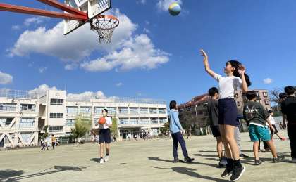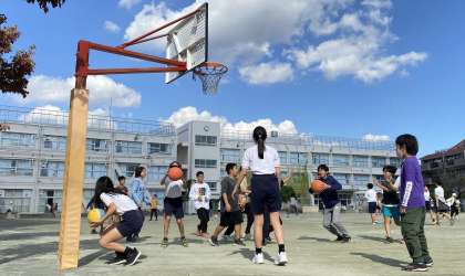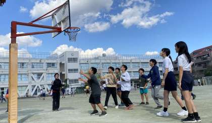 一つのバスケットゴールを使って、いくつかのグループが入り交じって、上手に活動しています。