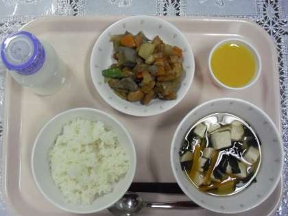 今日のメニューは、ご飯、鶏とジャガイモの揚げ煮、若竹汁、オレンジゼリー、牛乳でした。