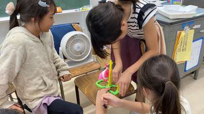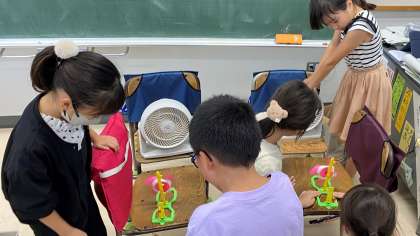 風のはたらきについて学習を進めています。「風車のものを持ち上げる力はどのようにすれば大きくなるか、予想を立てて実験しました。