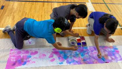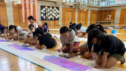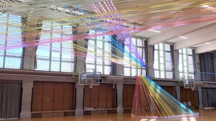 会場の装飾に取り組んでいます。写真は、5年生の共同制作「虹の夢」と6年生「レインボーライン」です。